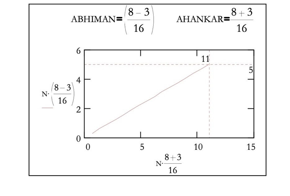 Sull’asse orizzontale è riportata l’estensione direzionale (11), corrispondente alla funzione di Ahankara–Gevurah, mentre sull’asse verticale è riportato il contenimento trattenuto (5), che rappresenta la funzione di Abhiman–Chesed: il punto (11,5) evidenzia il bilanciamento funzionale tra le due componenti.