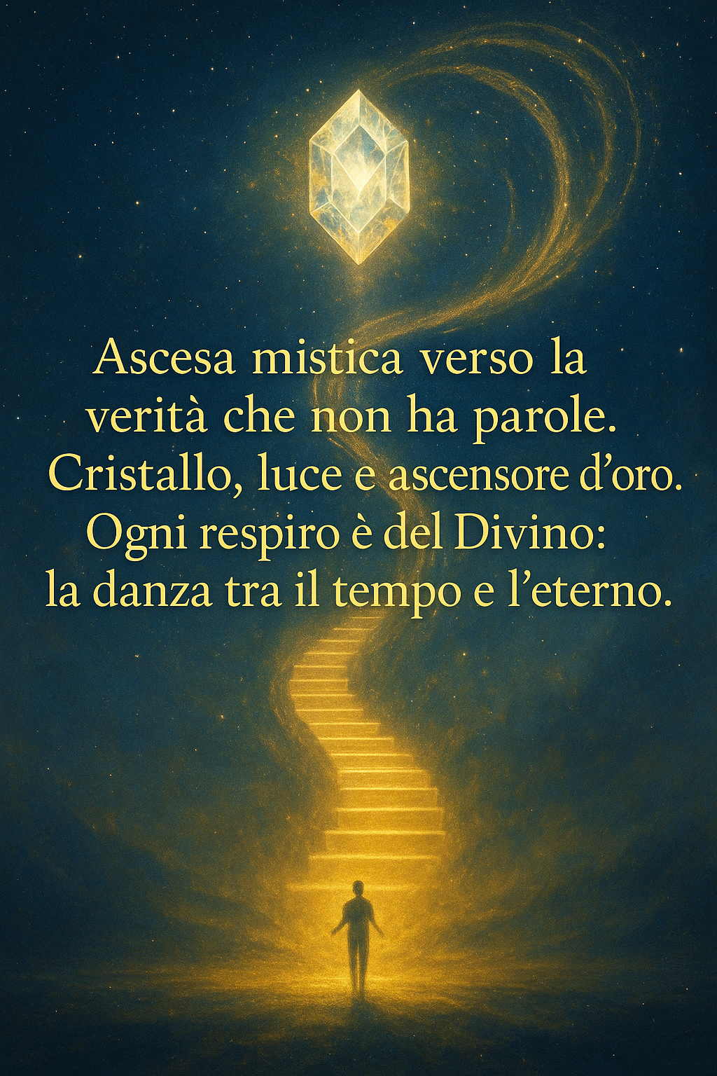Ascesa mistica verso la verità che non ha parole. Cristallo, luce e ascensore d’oro. Ogni respiro è del Divino: la danza tra il tempo e l’eterno.